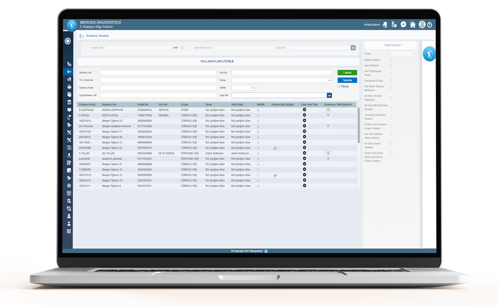 Mergentech Yetkilendirme Modülü, sistem kullanıcılarının yetkilendirilebilmesi için gerekli tanımlamaların (Kullanıcı, Rol, Kullanıcı Grup, From Kısıt, Duyuru, Komisyon, SMS vb.) yapılmasına ve görüntülenmesine imkan sağlarken, kullanıcılara ve rollere yetki verme veya kısıt ekleme, şifre değiştirme işlemi, belge imza yetkisi belirleme, ek ders işlemleri için kullanıcı ve birim yetkilendirme, kural tanımlama ve kuralları rollerle eşleştirme, yetkilendirme modülü içerisinde kullanıcısı olmayan personellere ve öğrencilere kullanıcı oluşturulması konularında da süreci yürütmeyi sağlamaktadır.